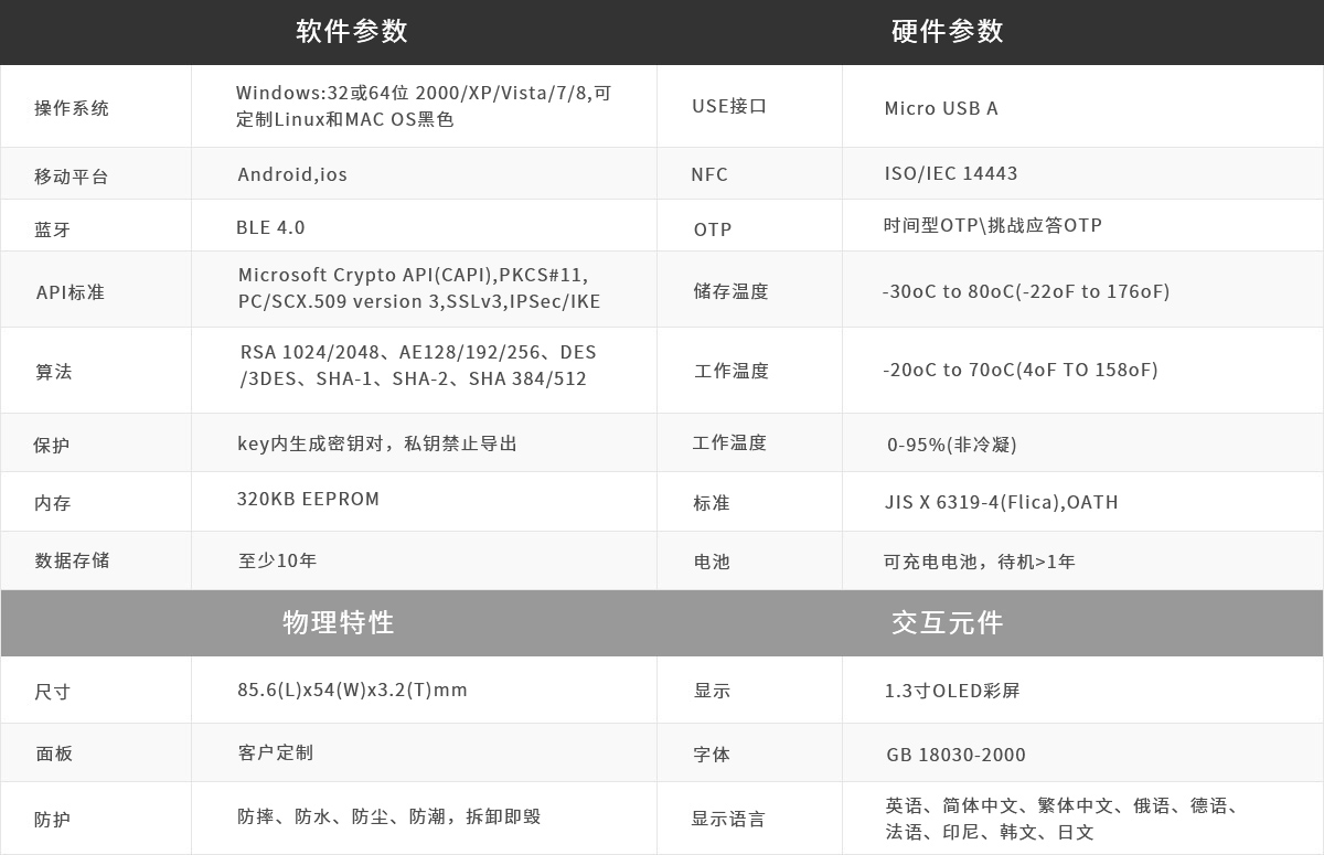 同时,支持蓝牙4.0安全连接机制,可与手机建立双向安全通讯渠道,作为外置安全模块提升移动端的安全,小巧便携,拓宽移动办公应用场景。产品功能灵活,易于集成至不同的应用系统,可扩展至金融支付、收单、办公安全、身份实名认证、公交等领域。
